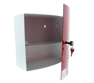 - Armoire pharmacie de secours avec 2 étagères et une porte unique.